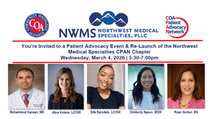 Join us on March 4, 2026 for an evening of patient advocacy and engagement. The Community Oncology Patient Advocacy Network (CPAN) will be back to relaunch our NWMS CPAN chapter. The CPAN Chapter of Northwest Medical Specialties teamed up with the Community Oncology Alliance (COA) Patient Advocacy Network (CPAN) in 2017 to educate cancer patients, (more…)